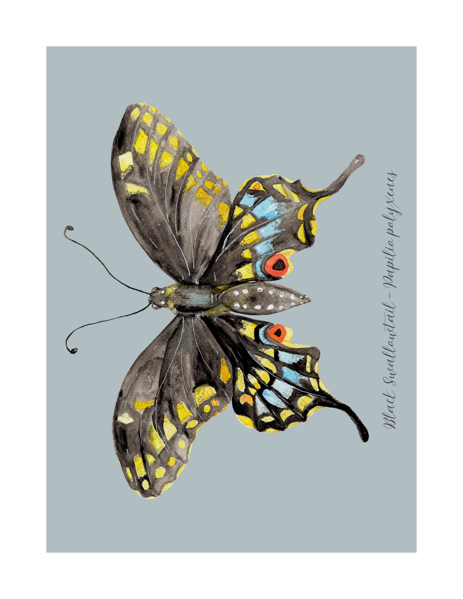 The Black Swallowtail (Papilio polyxenes) is a striking butterfly, known for its deep black wings adorned with rows of yellow spots and touches of iridescent blue. Commonly found in open fields, gardens, and meadows, it is often seen fluttering among parsley, dill, and other host plants where it lays its eggs. Its large, graceful flight and vibrant colors make it a favorite sight throughout the summer.