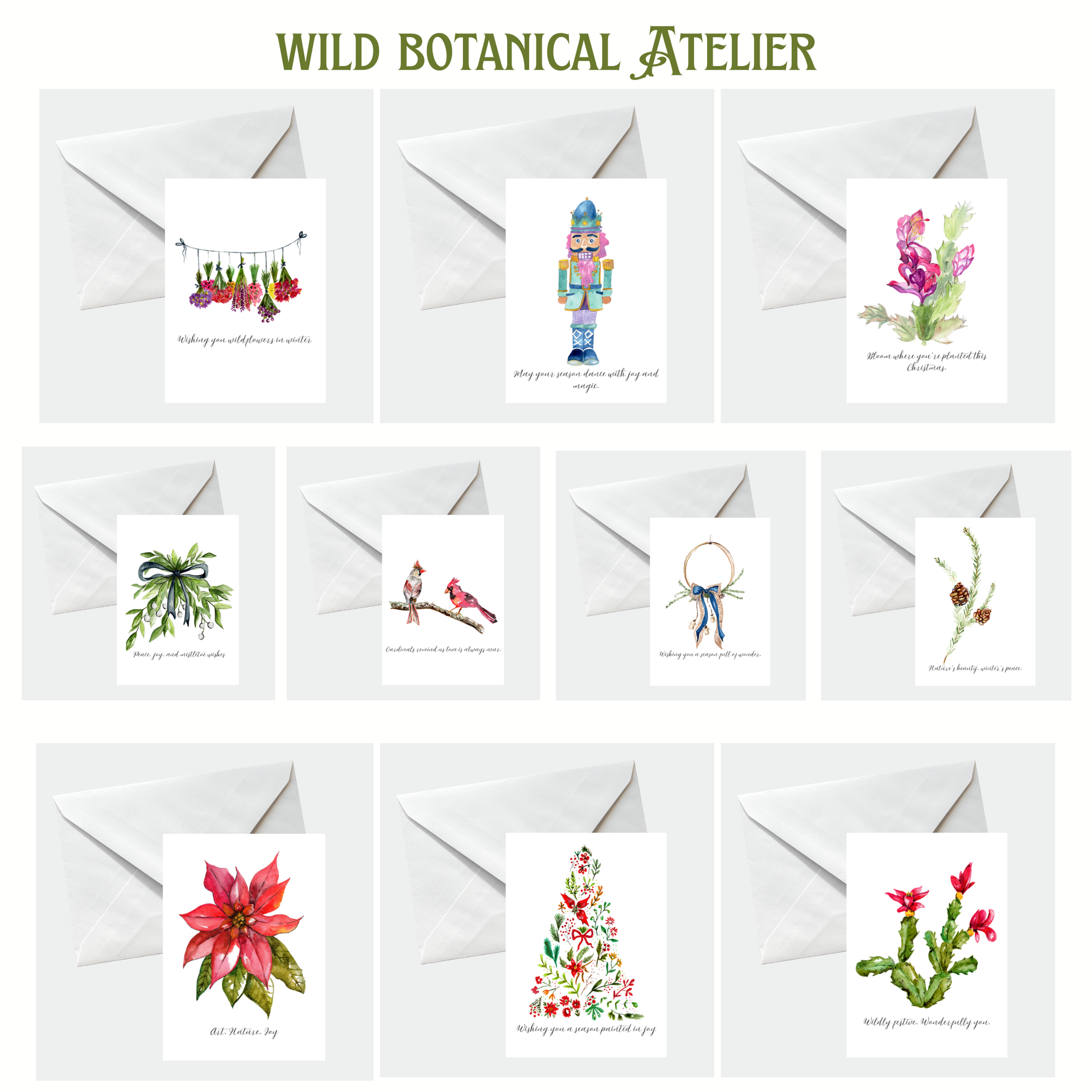 Share the beauty of the season with our watercolor Christmas card collection, inspired by the quiet magic of winter botanicals. Each pack includes ten unique designs — from cheerful Christmas cacti and bright red cardinals to festive poinsettias and a whimsical botanical Christmas tree.